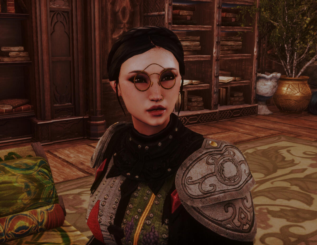 Raised under the careful, guided hand of Eris Blackthorn, she now has grown into a capable woman, scholar and clerical menace. Her story began in a long, cold winter of Skyrim, south of Solitude when her mother's carriage was attacked by maurauders. Unknown assassins had slain her family and seemingly her until Eris discovered the grim scene with locals as she was on her way to make trade into the great city. Nursing the child alongside her elder sister to health, she adopted her when no one else wanted to them in. She honed her skills magically and technically and learnt every part of the trade, just like the rest raised under the woman's care. In particular, she learnt of skills similar to that of a Vateshran, the art of storytelling and verbal historical accounts beneath the watchful gaze of the Raven-Seer clan. Beautiful, fair and good with a quill as well as she was with bound weaponry, she researched her way throughout the lands as the trio traveled.